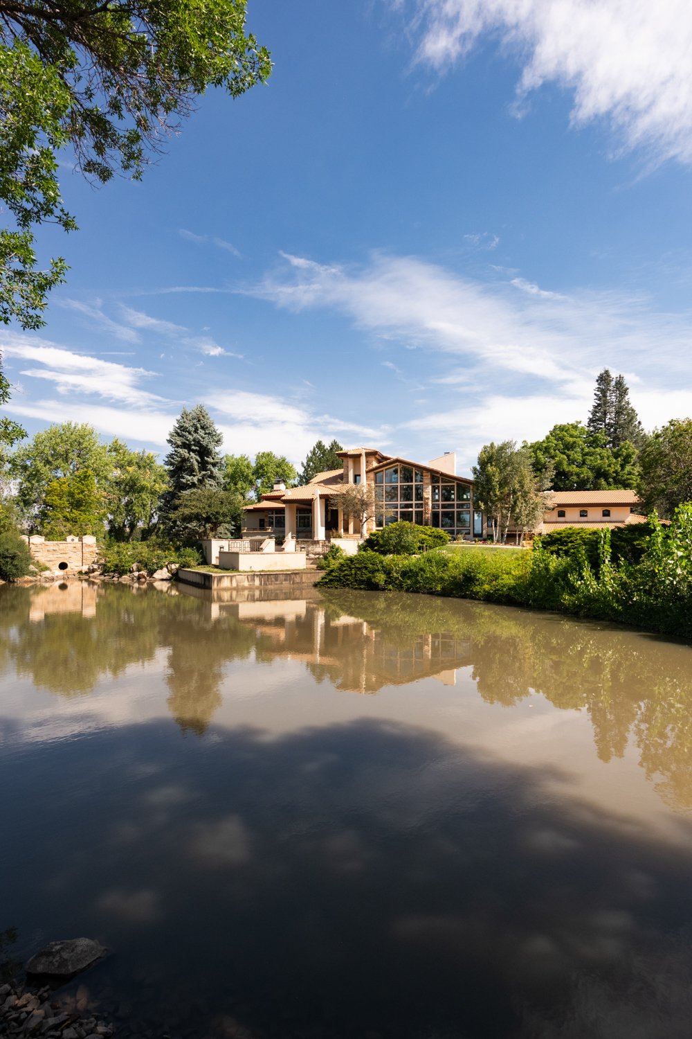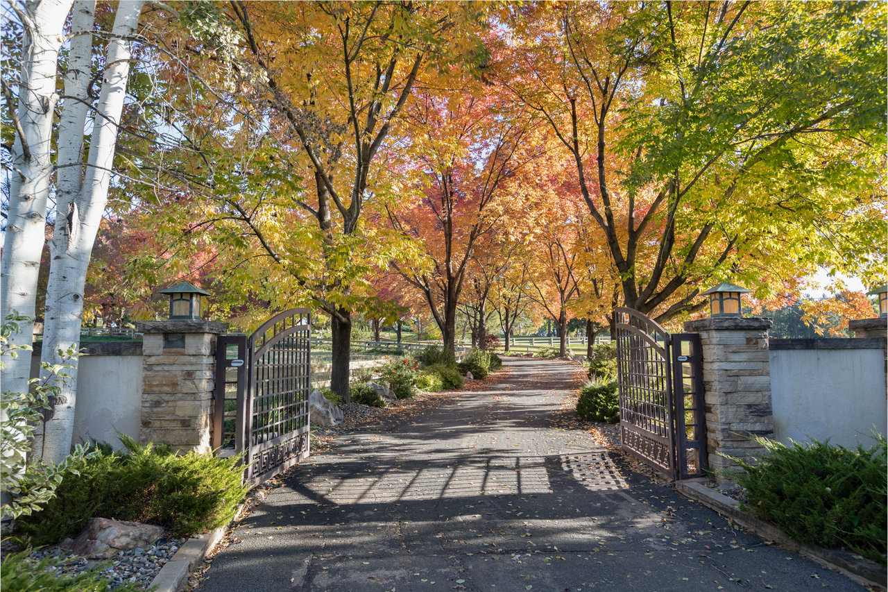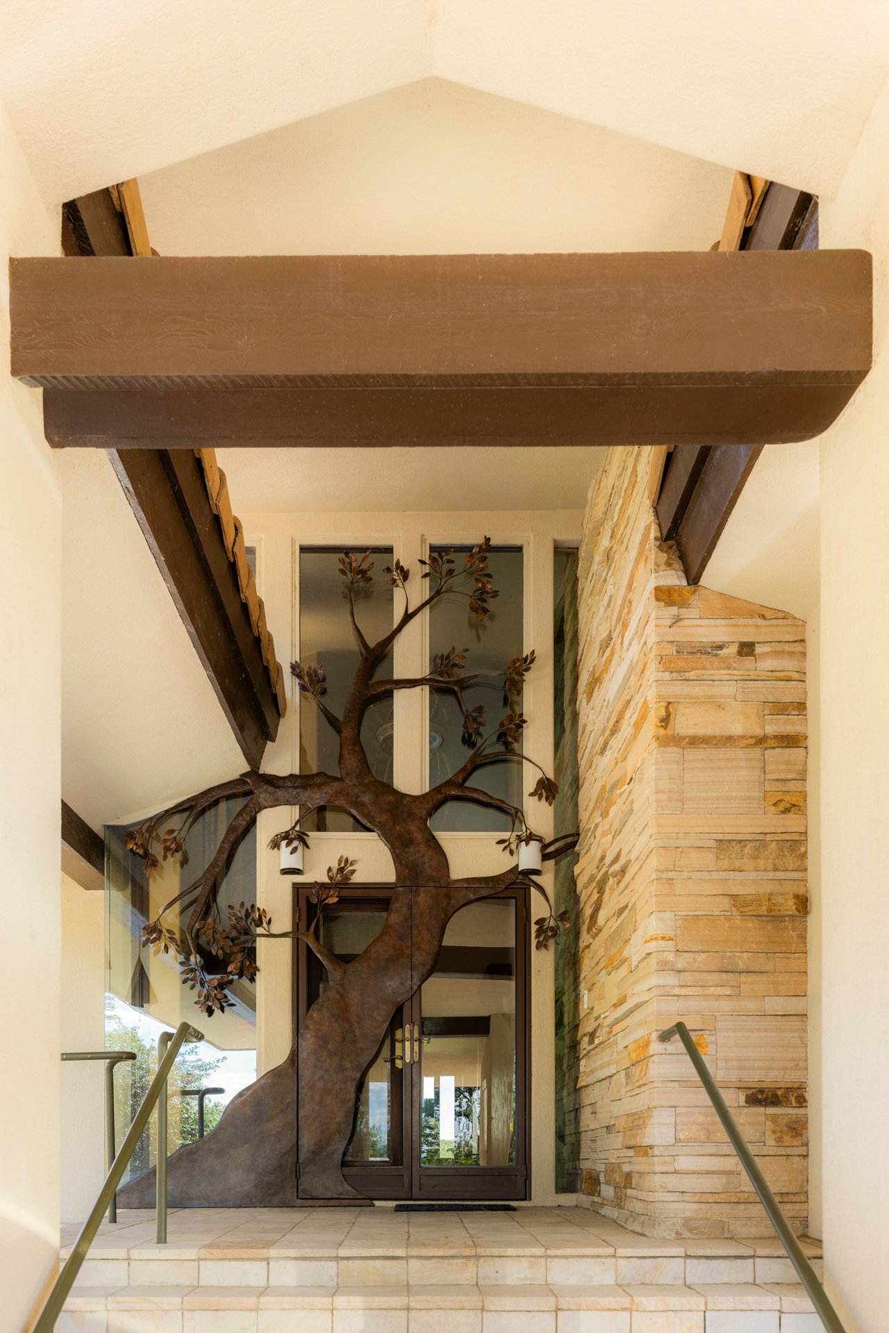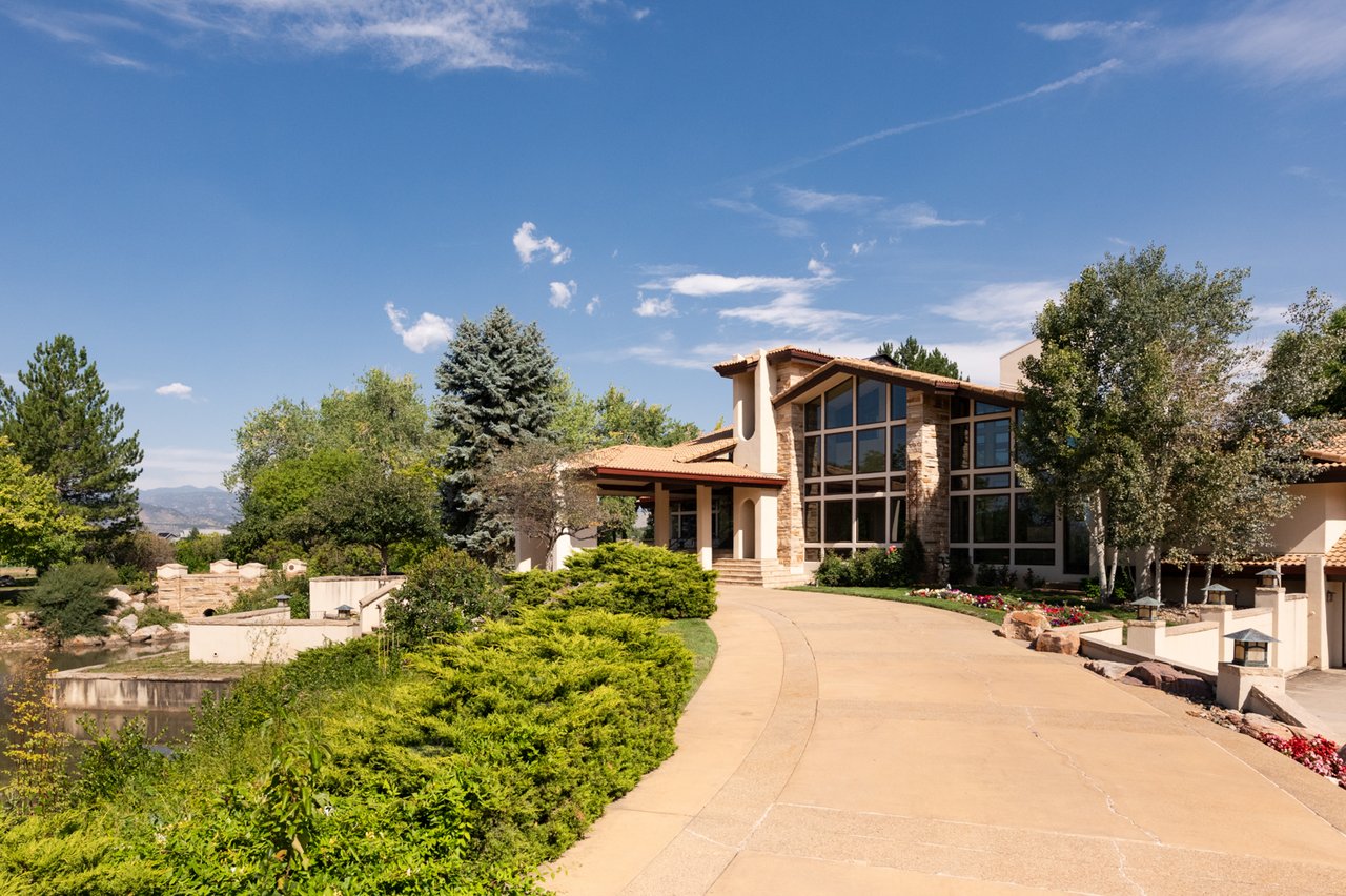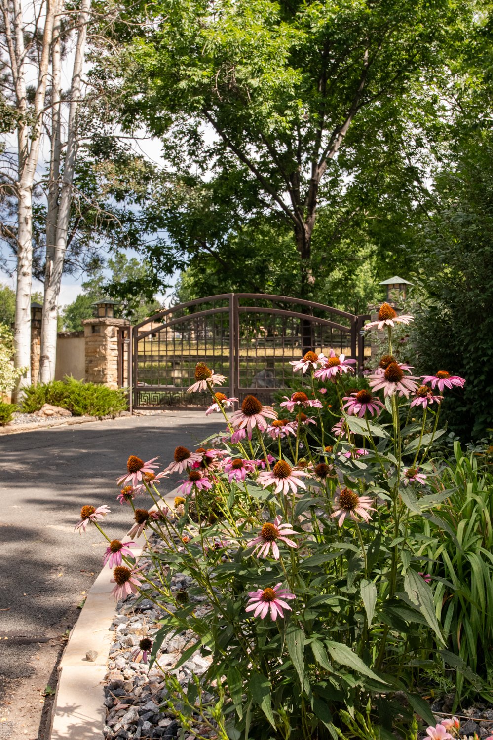 A grand entrance through a private gate sets the tone for an enchanting experience. A stately, winding pathway framed by mature trees leads you to the residence, revealing meticulously manicured landscaping, captivating views of your own idyllic ponds, and awe-inspiring mountains. The home's elegant facade, featuring a stunning custom metalwork tree on the front door, commands attention.