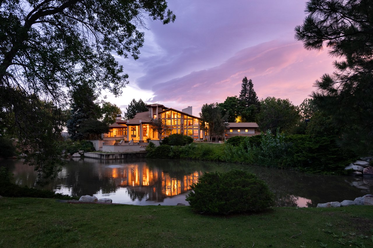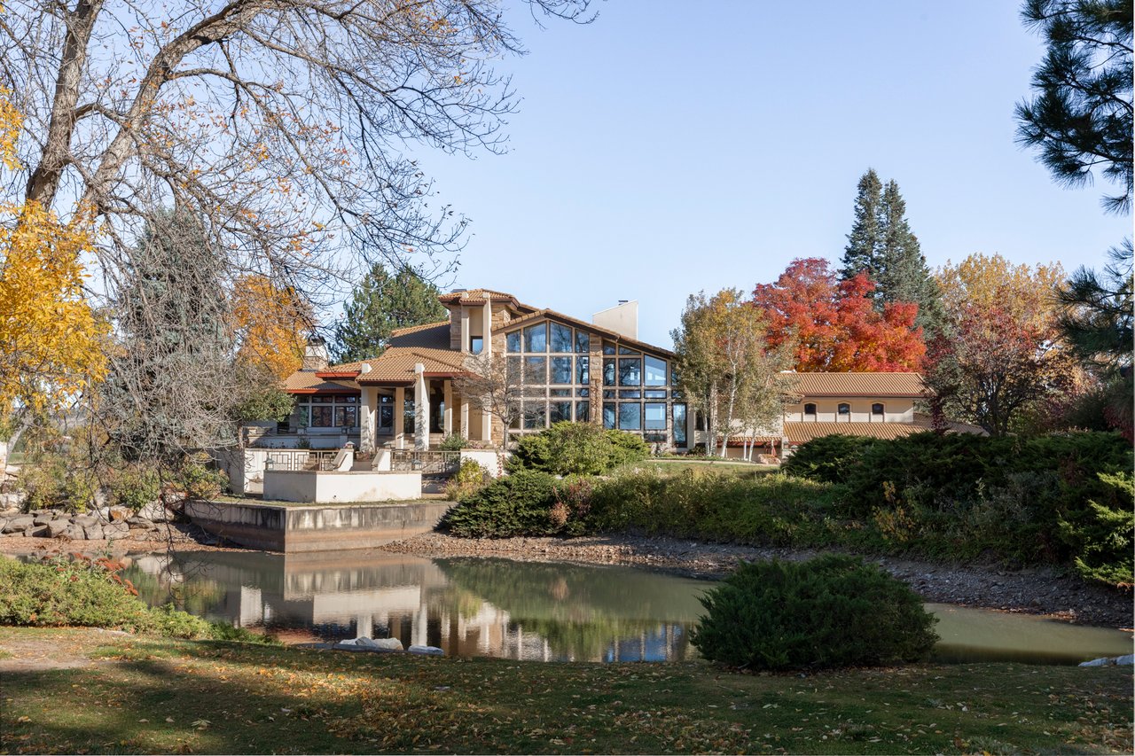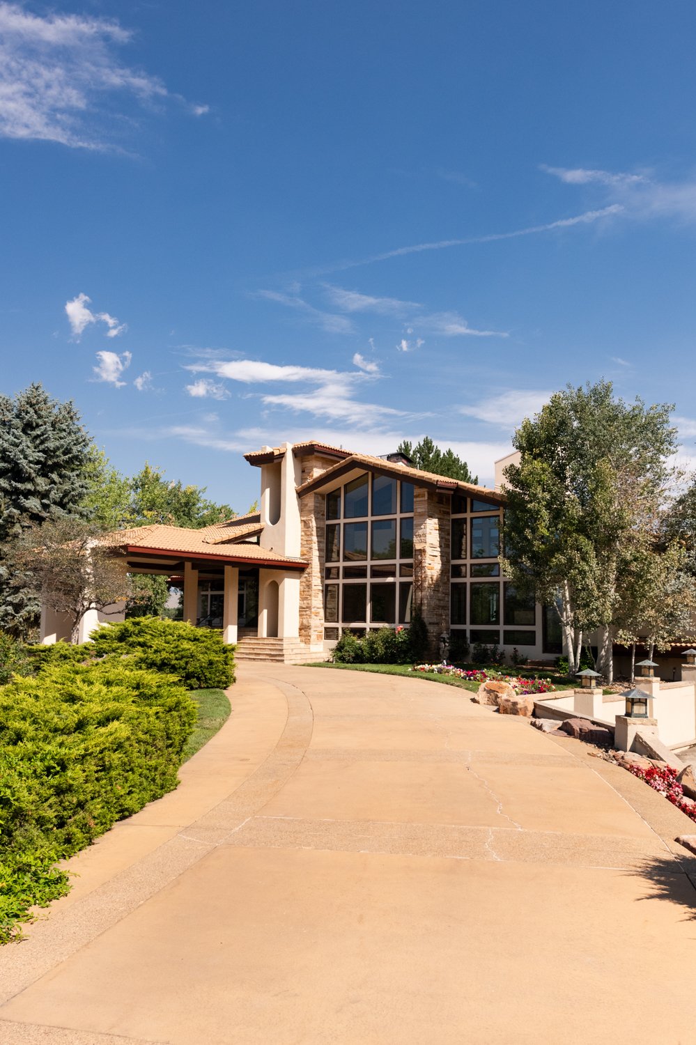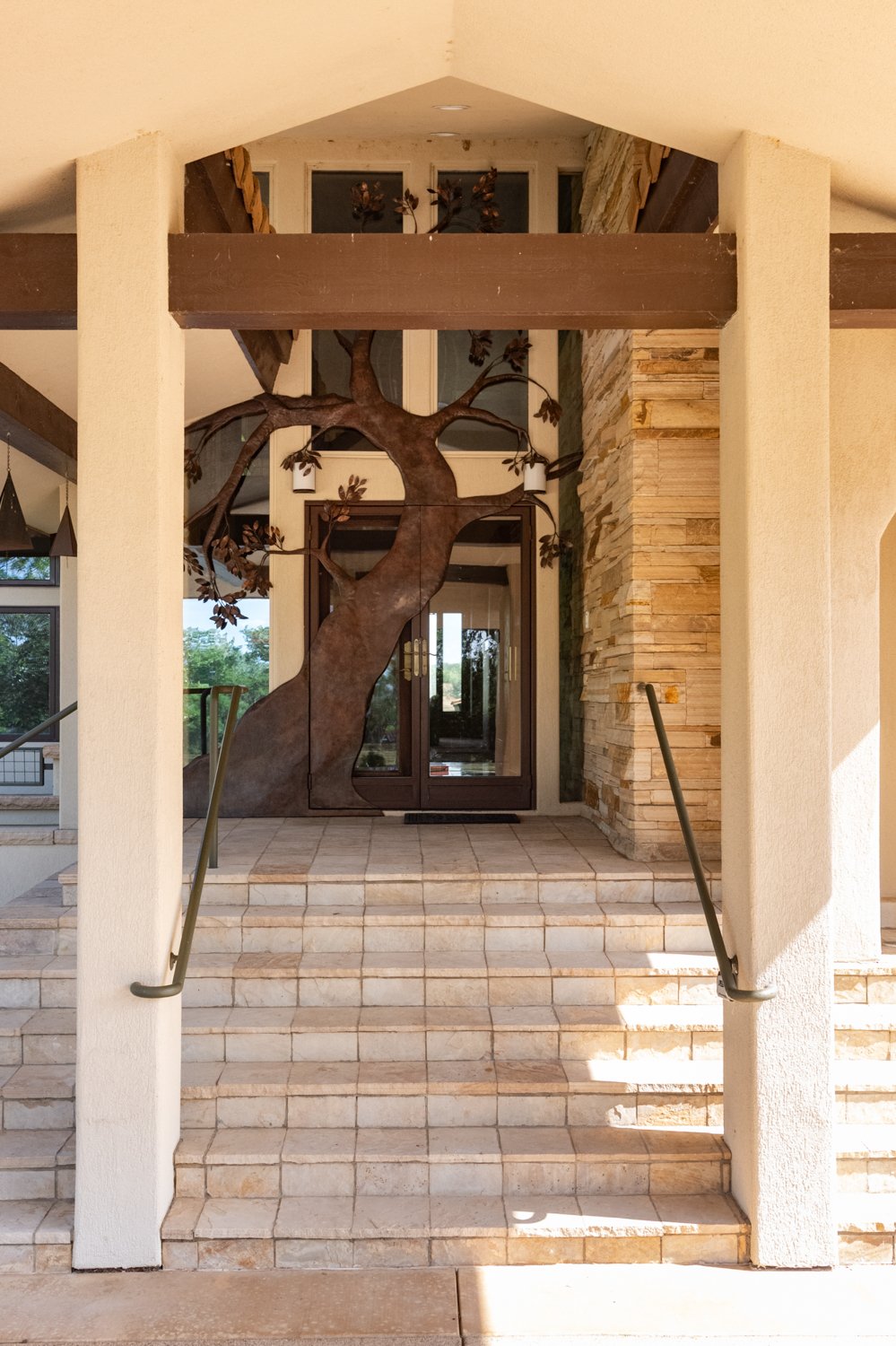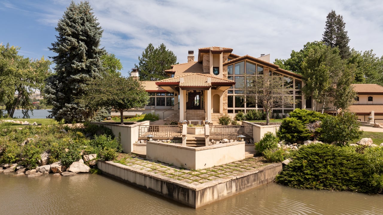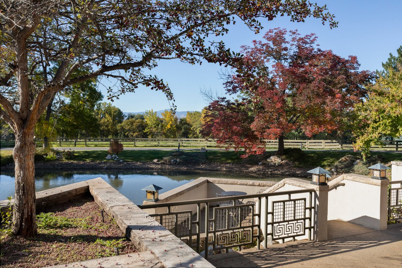 A grand entrance through a private gate sets the tone for an enchanting experience. A stately, winding pathway framed by mature trees leads you to the residence, revealing meticulously manicured landscaping, captivating views of your own idyllic ponds, and awe-inspiring mountains. The home's elegant facade, featuring a stunning custom metalwork tree on the front door, commands attention.
