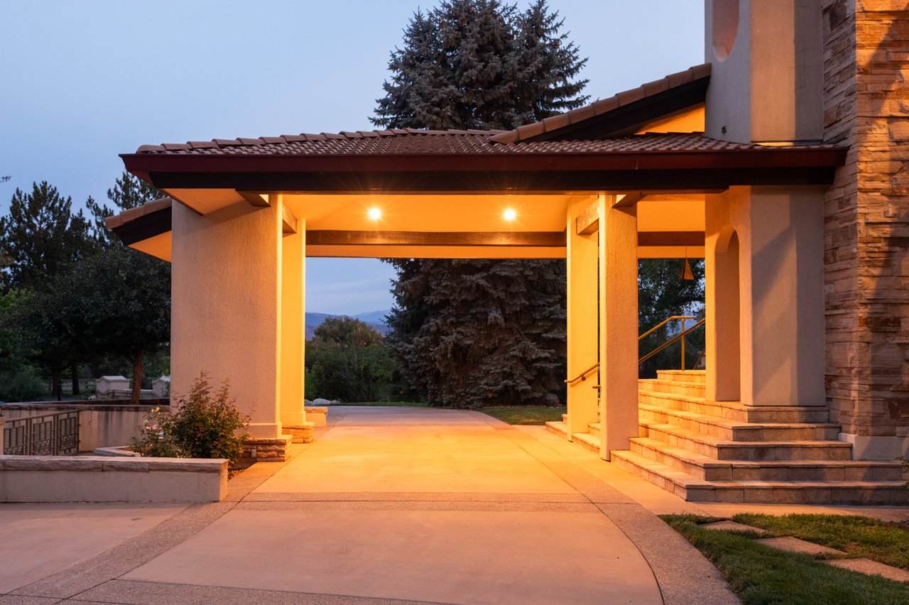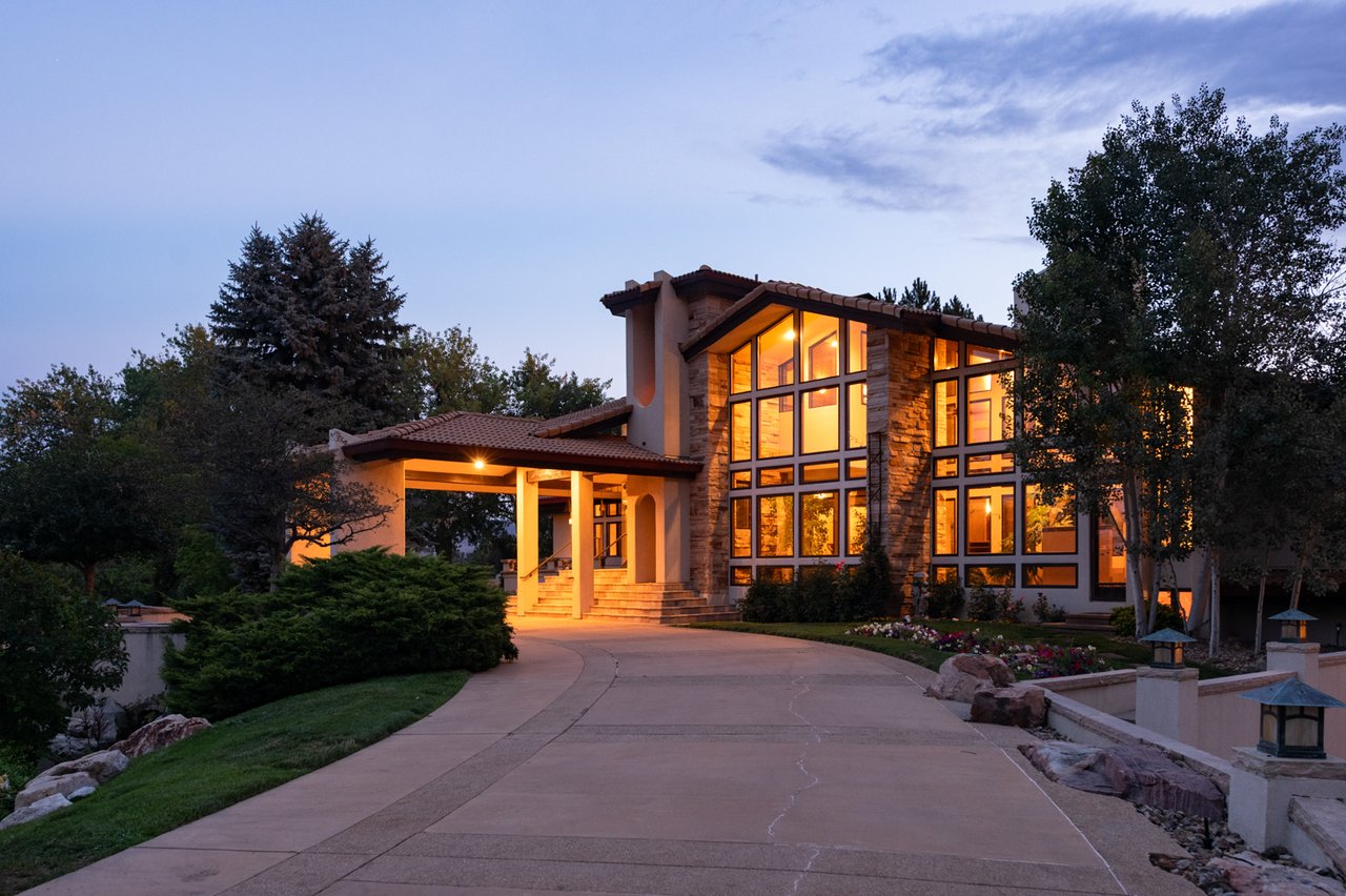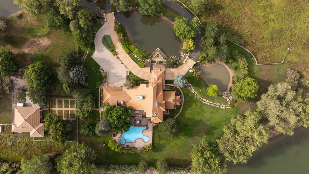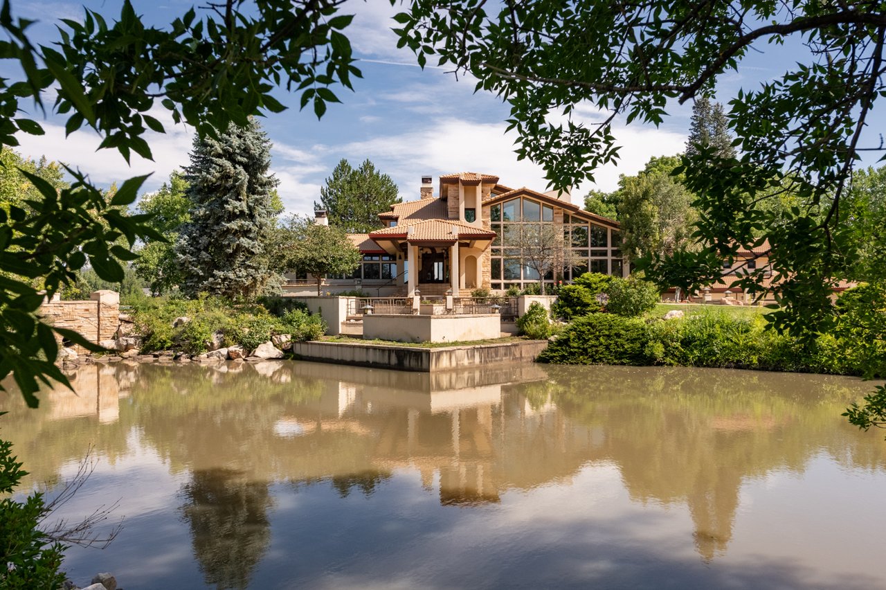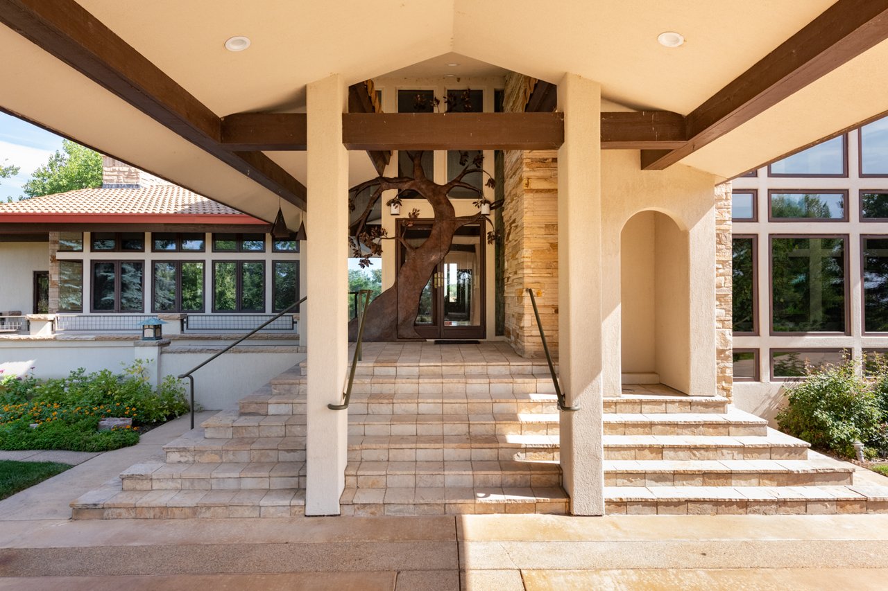 A grand entrance through a private gate sets the tone for an enchanting experience. A stately, winding pathway framed by mature trees leads you to the residence, revealing meticulously manicured landscaping, captivating views of your own idyllic ponds, and awe-inspiring mountains. The home's elegant facade, featuring a stunning custom metalwork tree on the front door, commands attention.