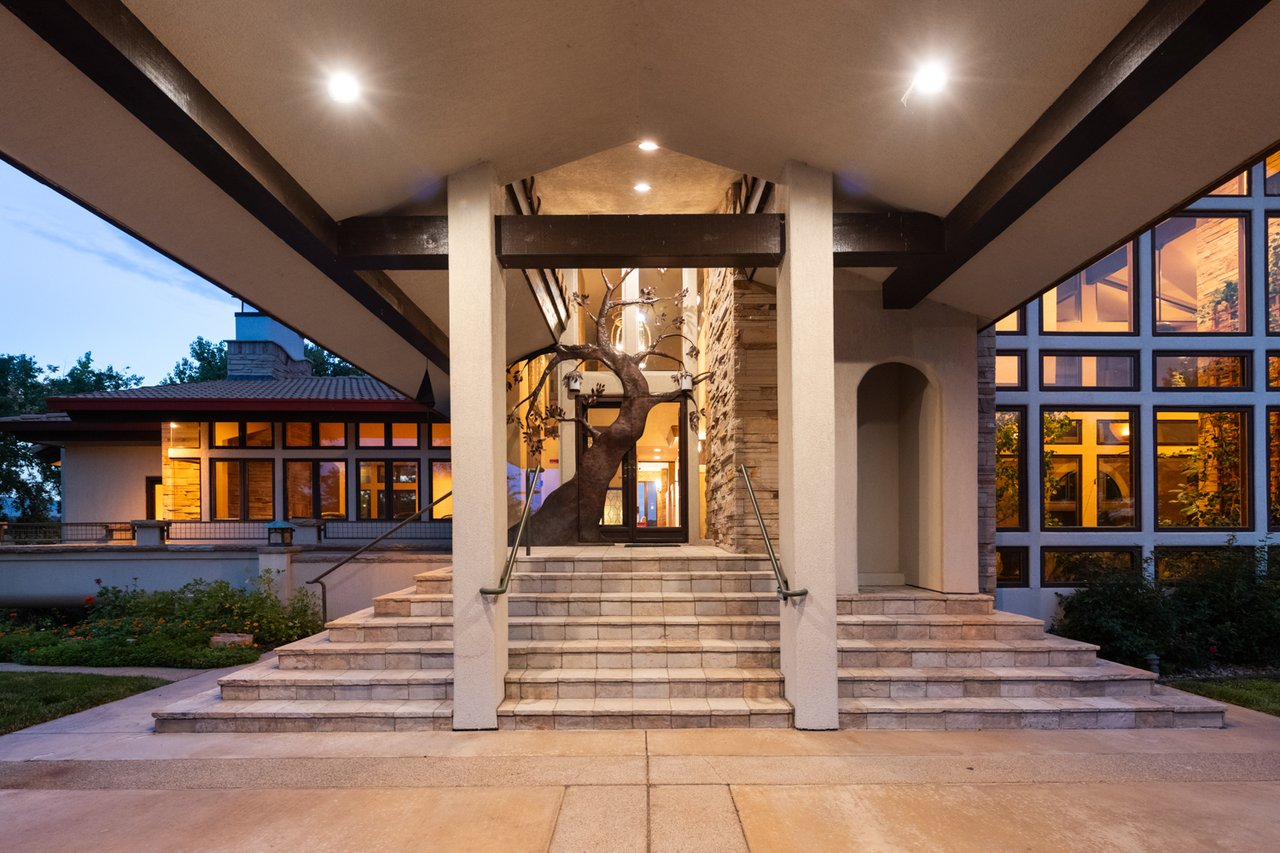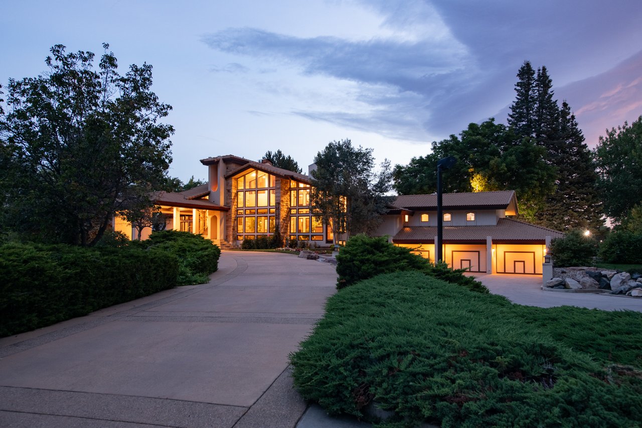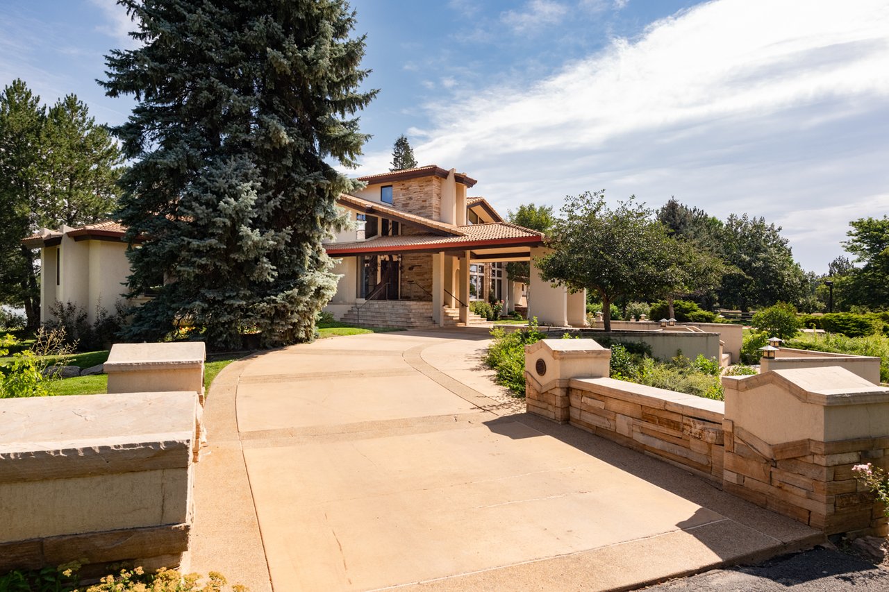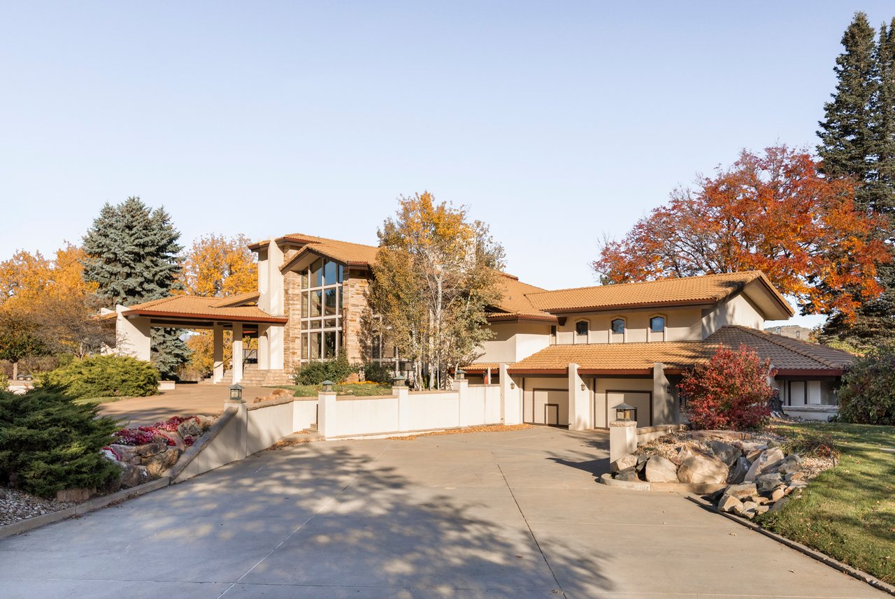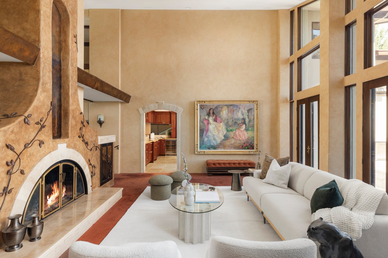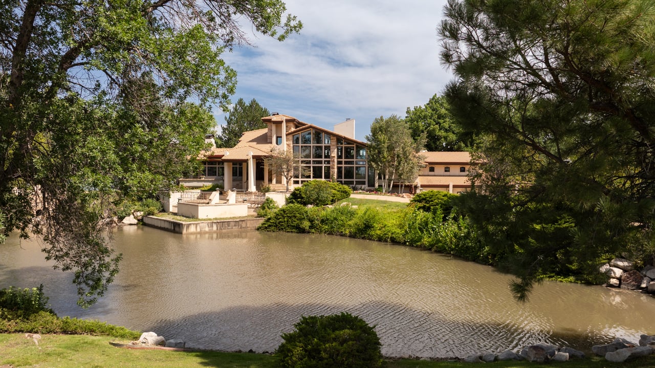 A grand entrance through a private gate sets the tone for an enchanting experience. A stately, winding pathway framed by mature trees leads you to the residence, revealing meticulously manicured landscaping, captivating views of your own idyllic ponds, and awe-inspiring mountains. The home's elegant facade, featuring a stunning custom metalwork tree on the front door, commands attention.