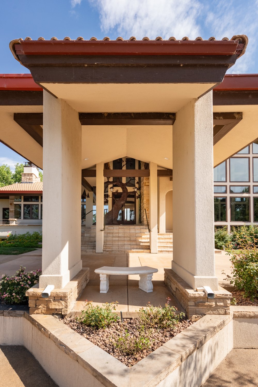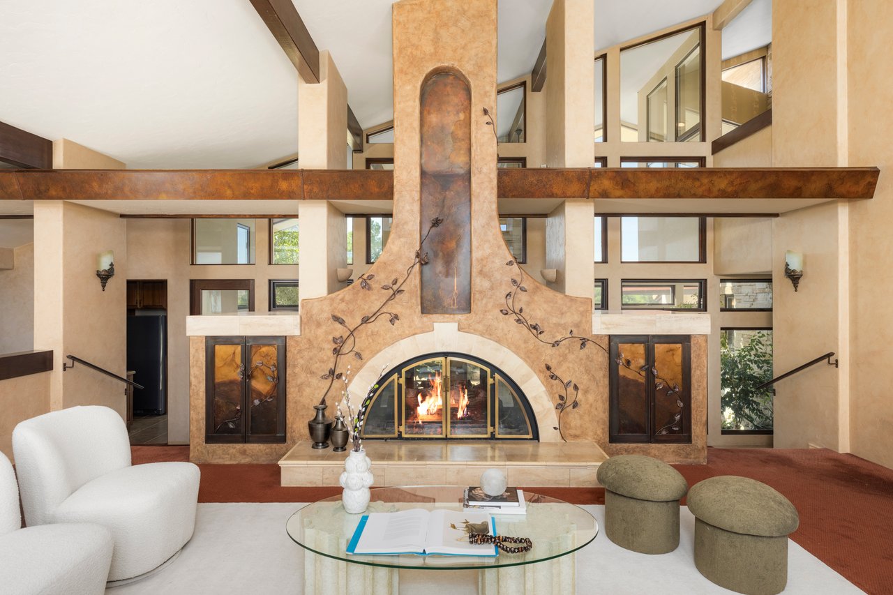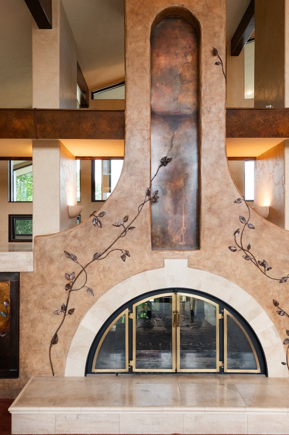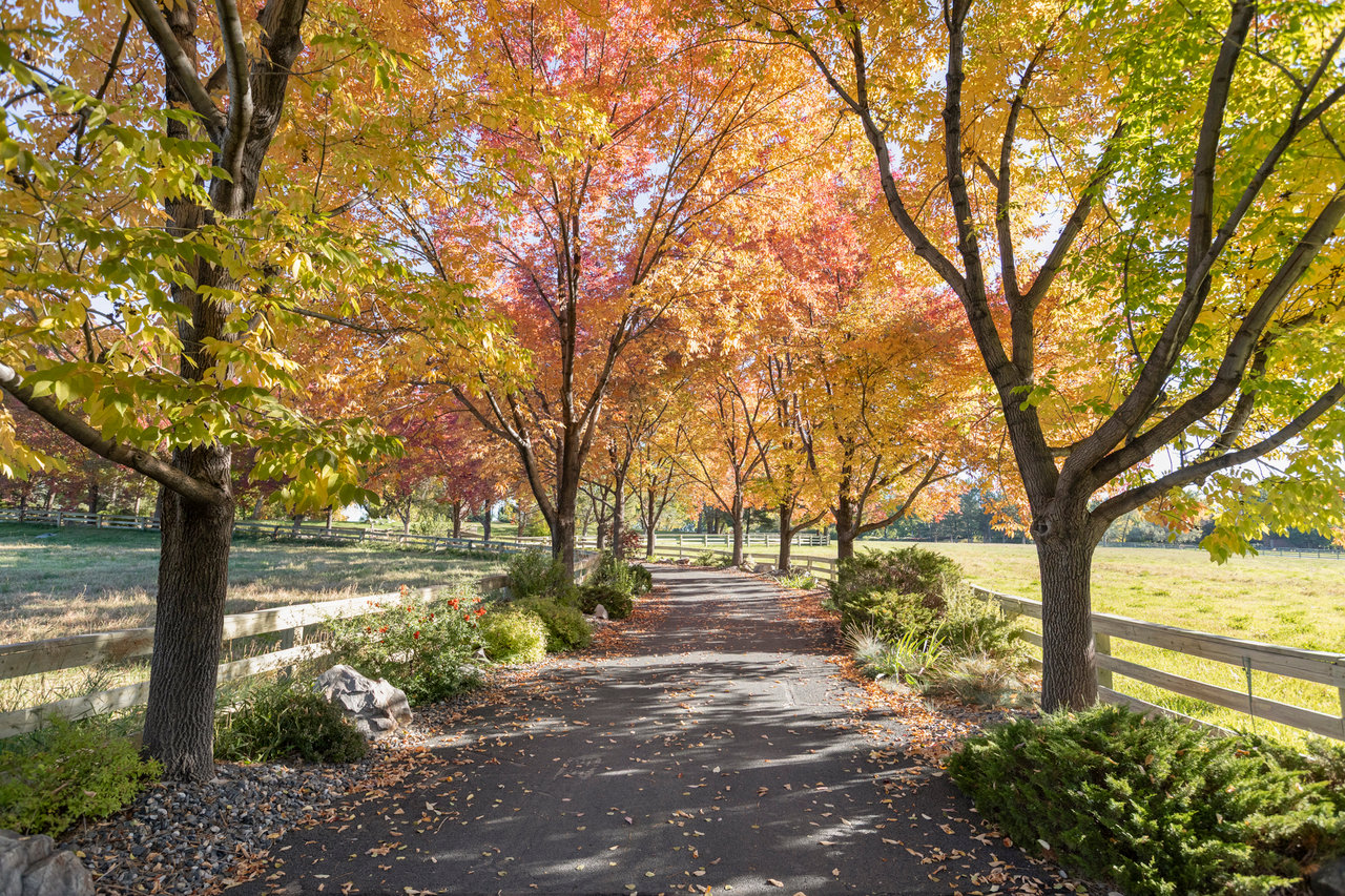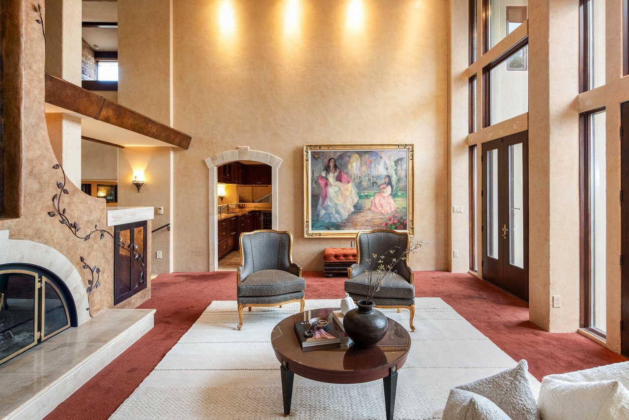 A grand entrance through a private gate sets the tone for an enchanting experience. A stately, winding pathway framed by mature trees leads you to the residence, revealing meticulously manicured landscaping, captivating views of your own idyllic ponds, and awe-inspiring mountains. The home's elegant facade, featuring a stunning custom metalwork tree on the front door, commands attention.