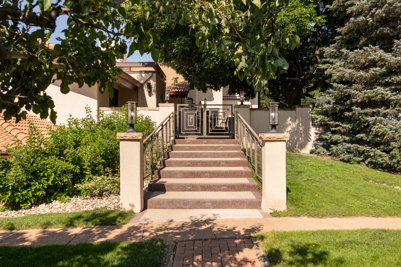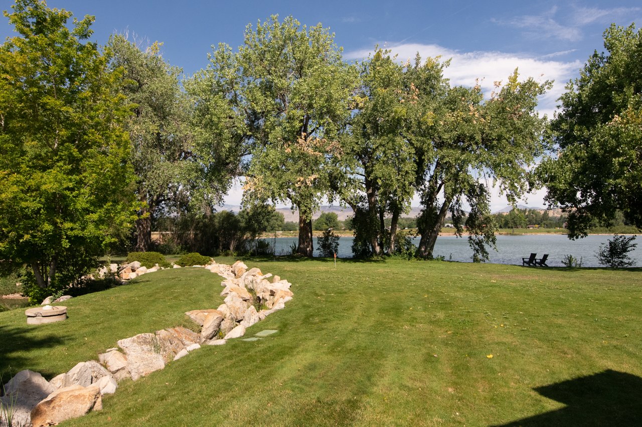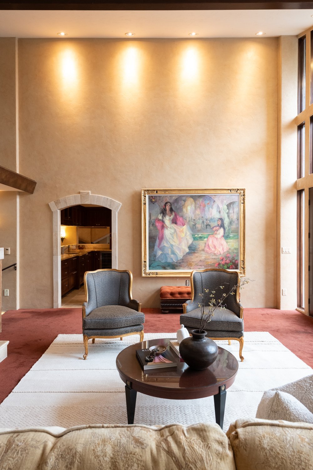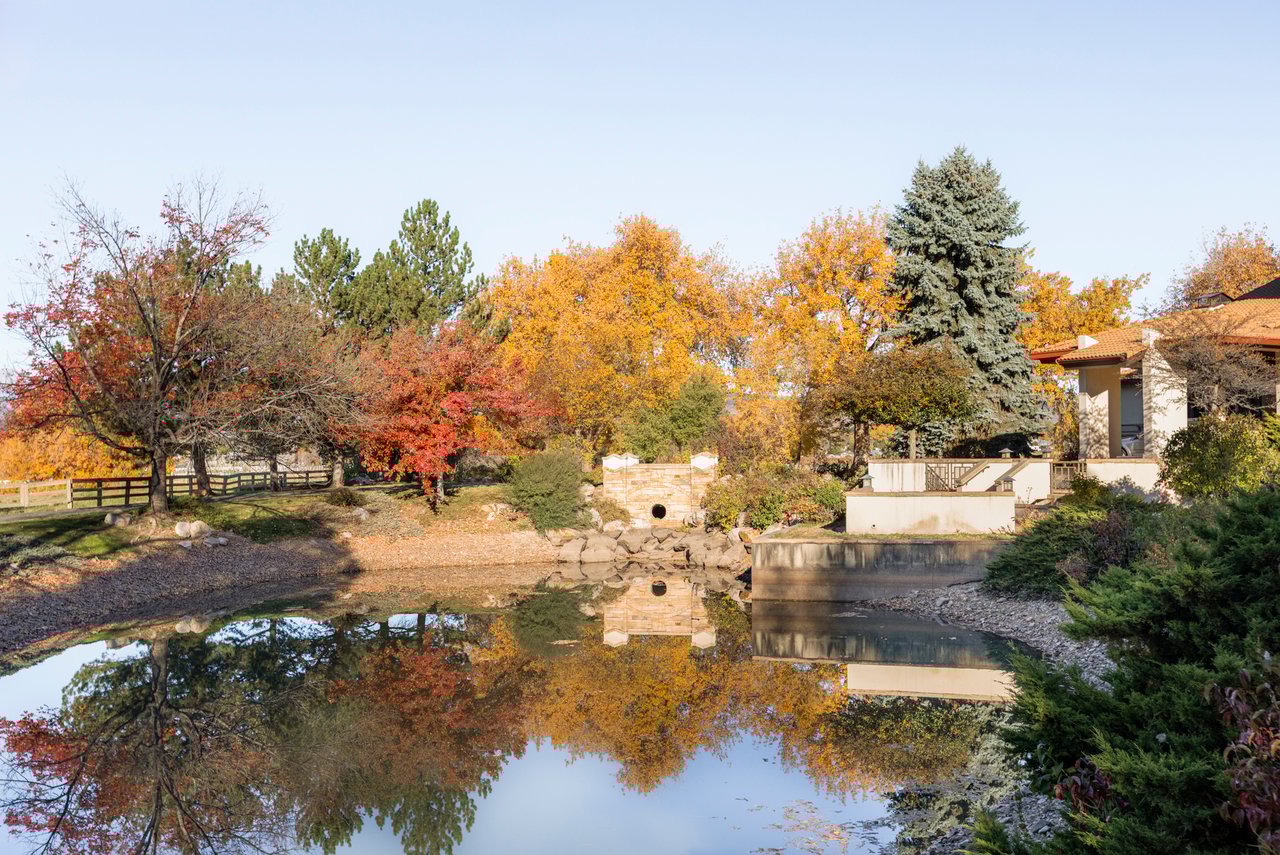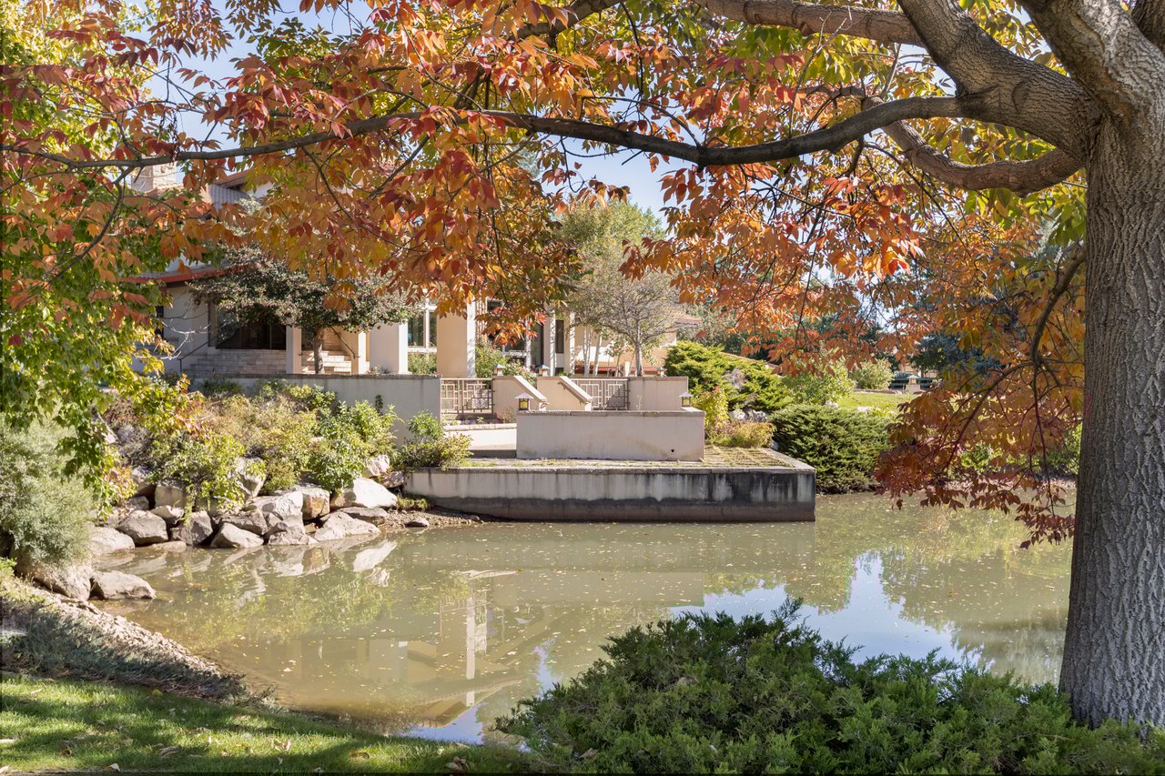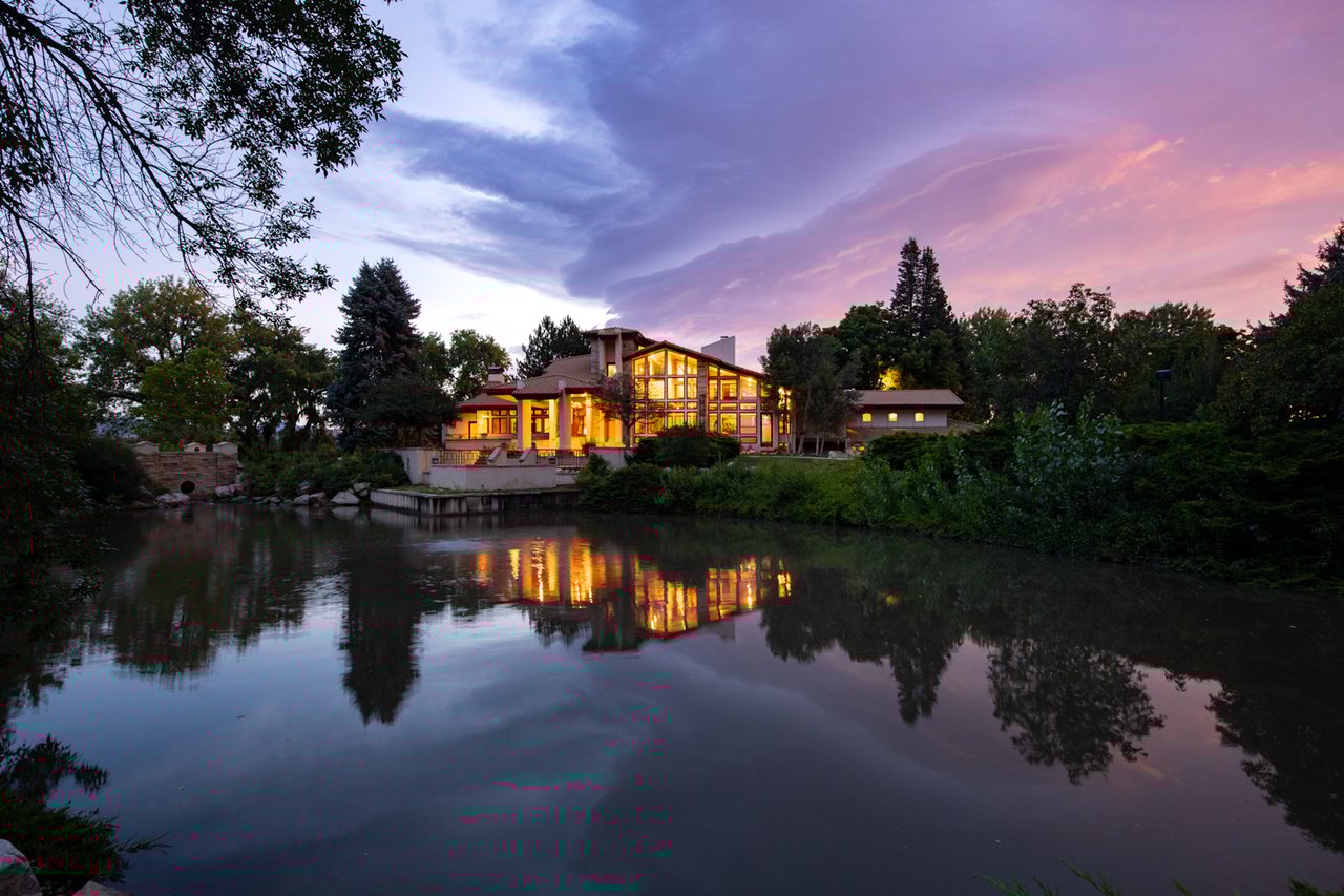A grand entrance through a private gate sets the tone for an enchanting experience. A stately, winding pathway framed by mature trees leads you to the residence, revealing meticulously manicured landscaping, captivating views of your own idyllic ponds, and awe-inspiring mountains. The home's elegant facade, featuring a stunning custom metalwork tree on the front door, commands attention.