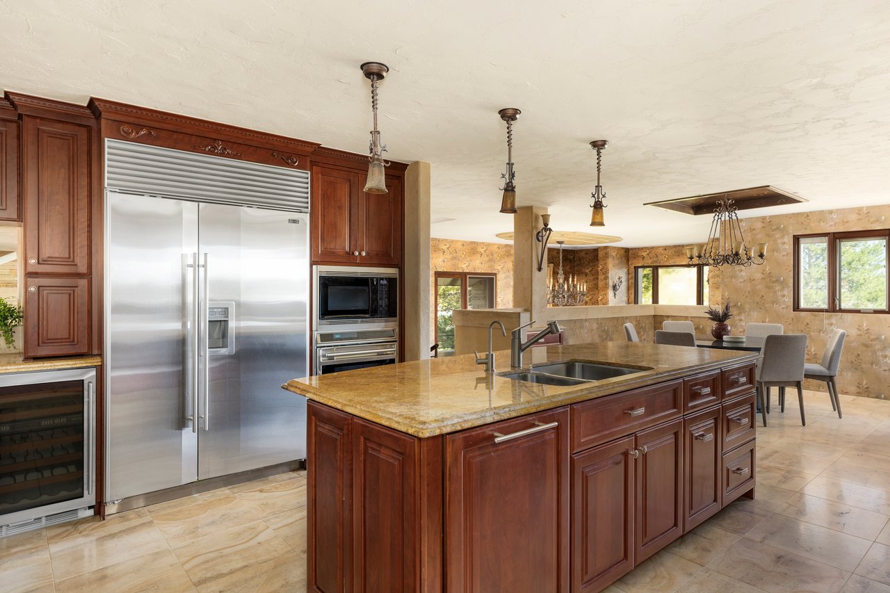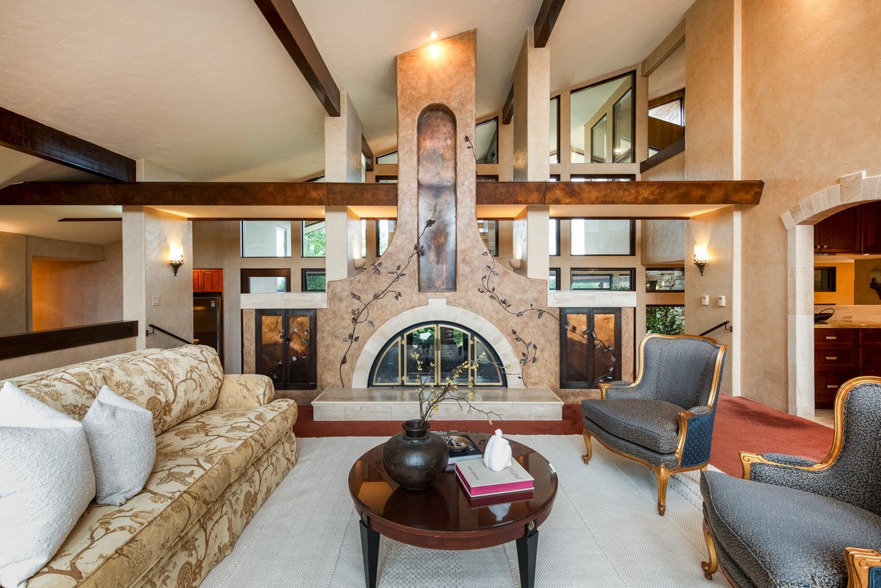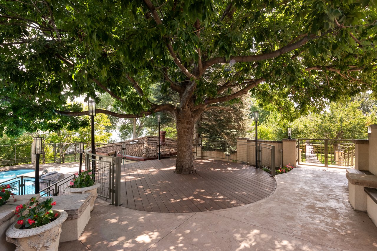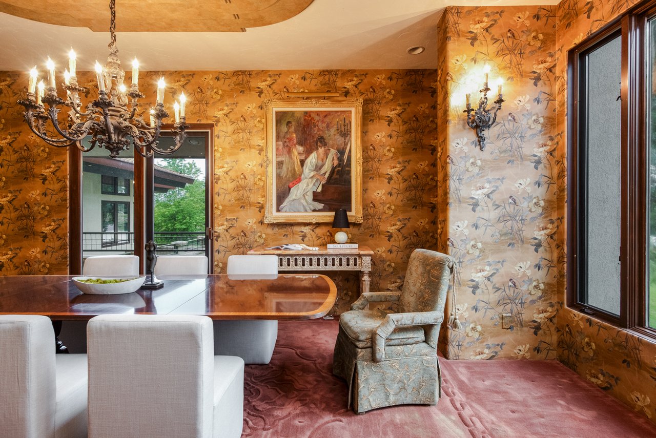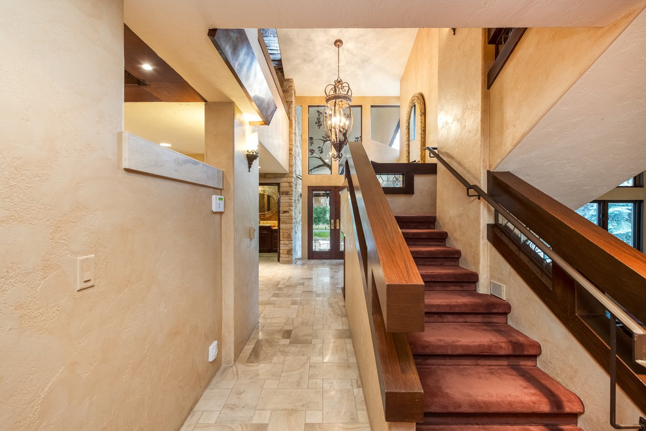 A grand entrance through a private gate sets the tone for an enchanting experience. A stately, winding pathway framed by mature trees leads you to the residence, revealing meticulously manicured landscaping, captivating views of your own idyllic ponds, and awe-inspiring mountains. The home's elegant facade, featuring a stunning custom metalwork tree on the front door, commands attention.