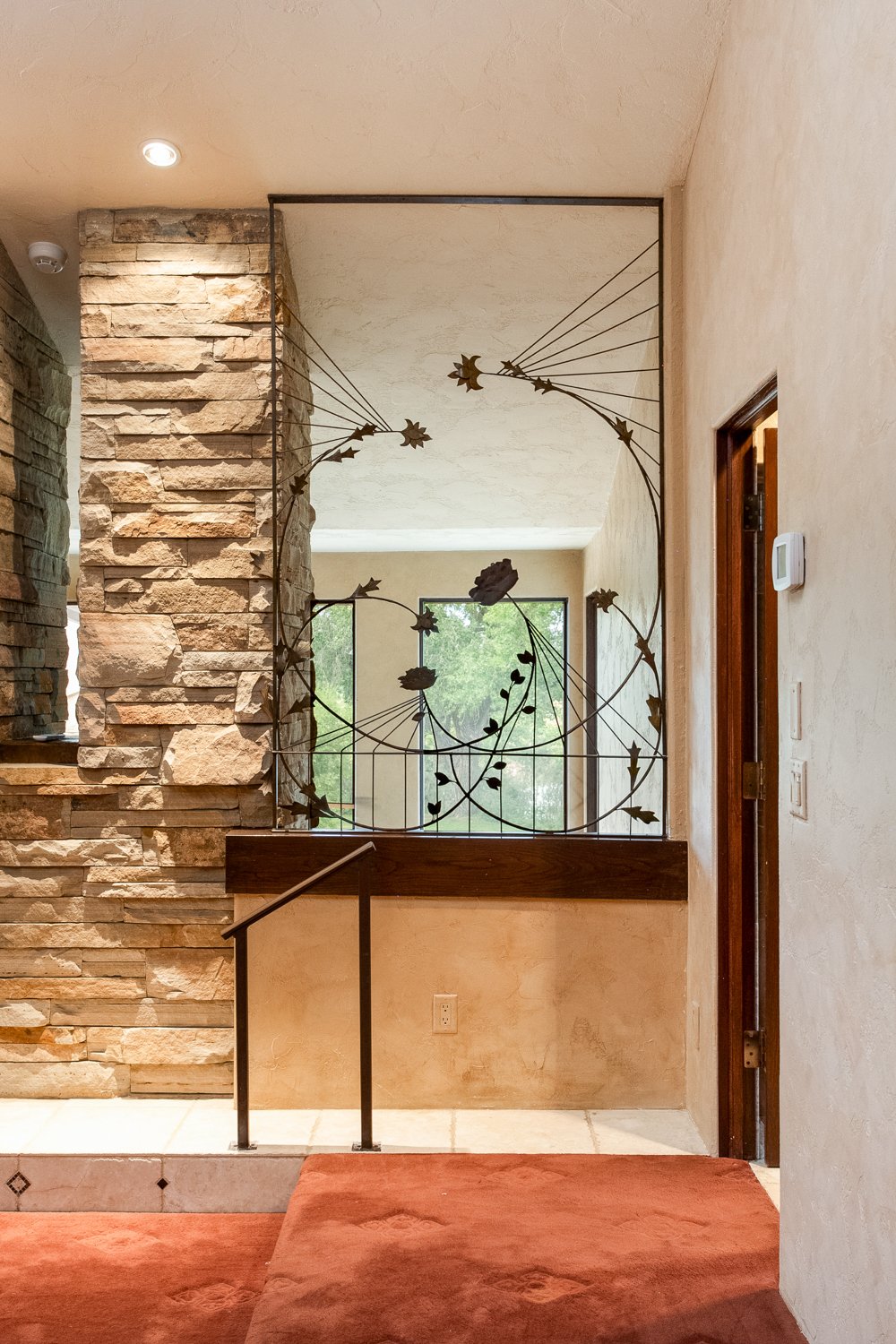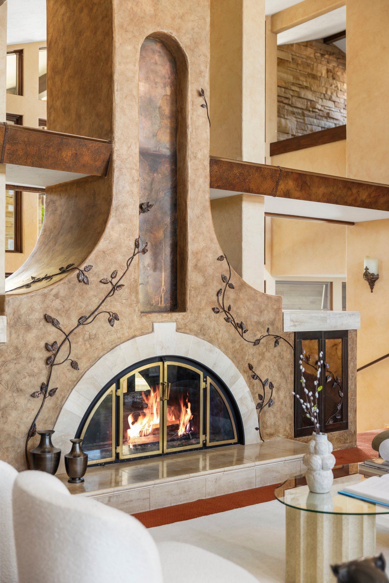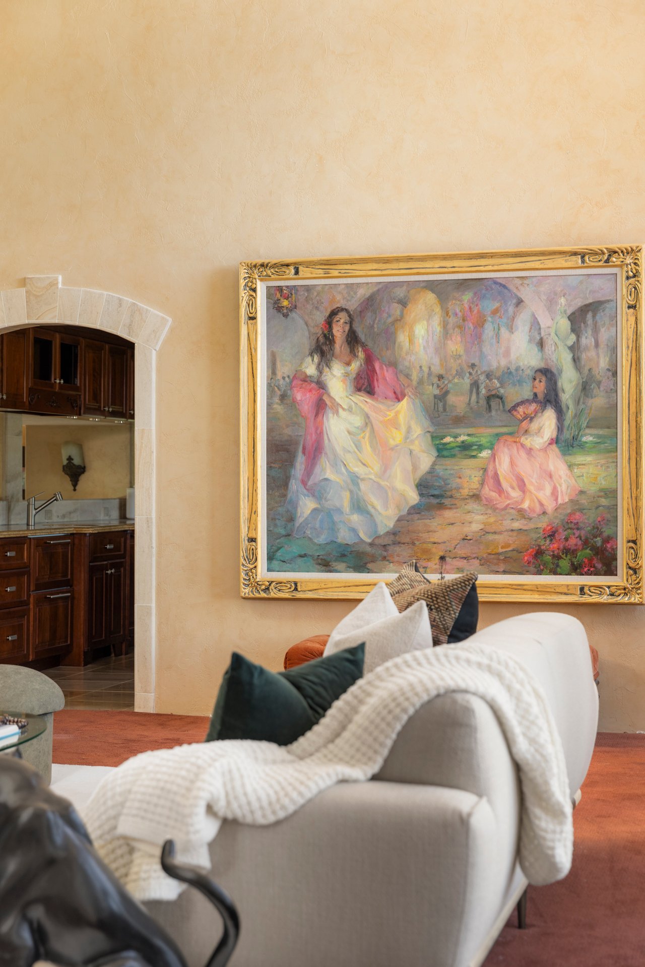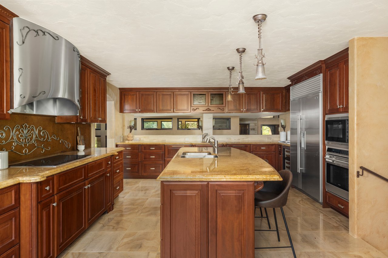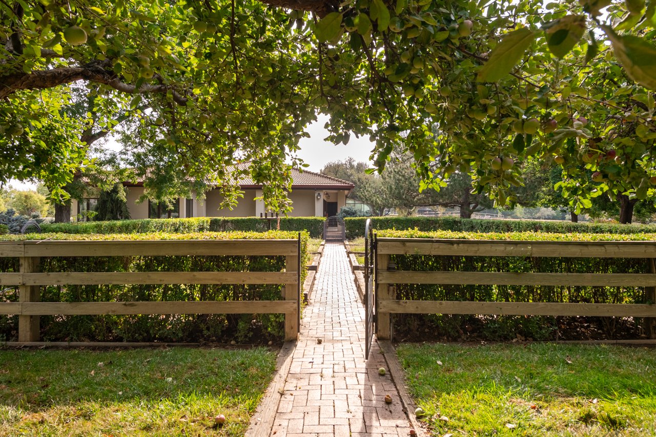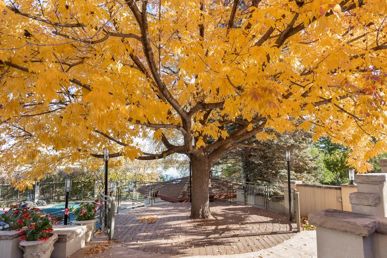 A grand entrance through a private gate sets the tone for an enchanting experience. A stately, winding pathway framed by mature trees leads you to the residence, revealing meticulously manicured landscaping, captivating views of your own idyllic ponds, and awe-inspiring mountains. The home's elegant facade, featuring a stunning custom metalwork tree on the front door, commands attention.