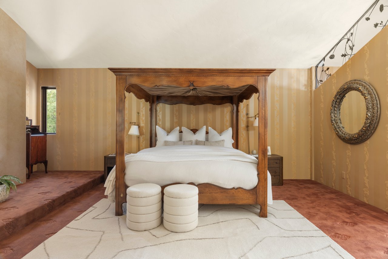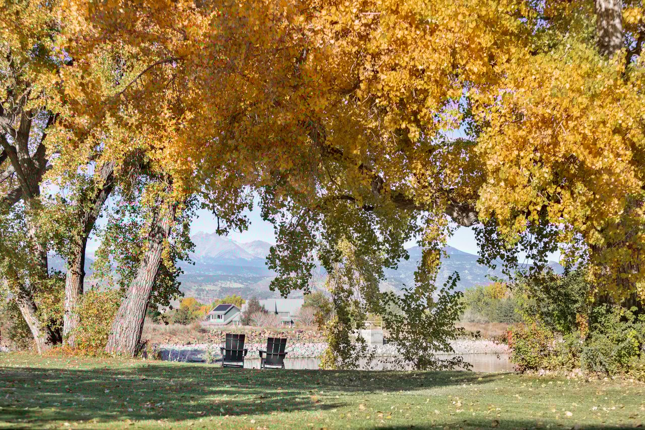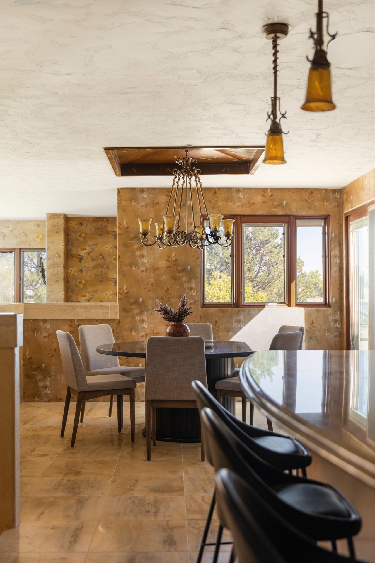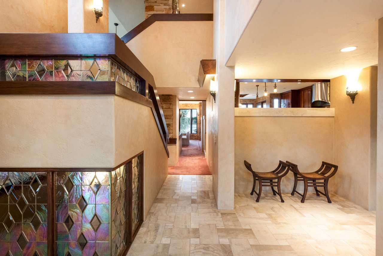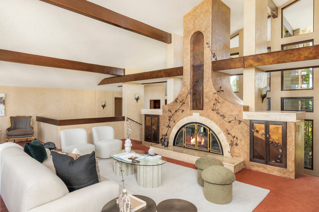 A grand entrance through a private gate sets the tone for an enchanting experience. A stately, winding pathway framed by mature trees leads you to the residence, revealing meticulously manicured landscaping, captivating views of your own idyllic ponds, and awe-inspiring mountains. The home's elegant facade, featuring a stunning custom metalwork tree on the front door, commands attention.