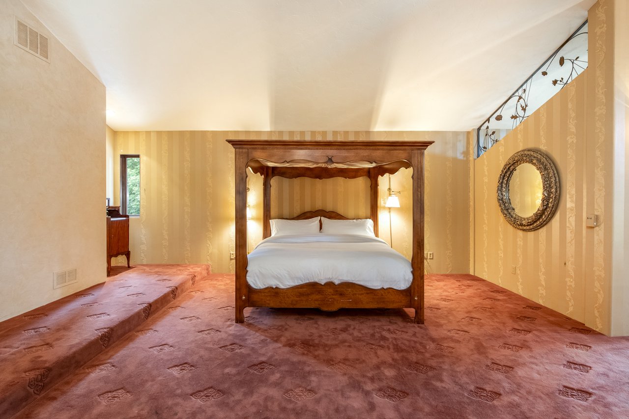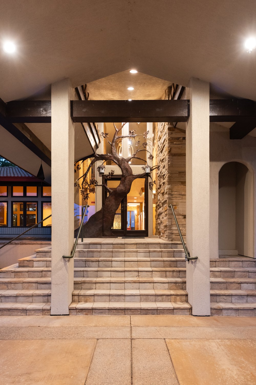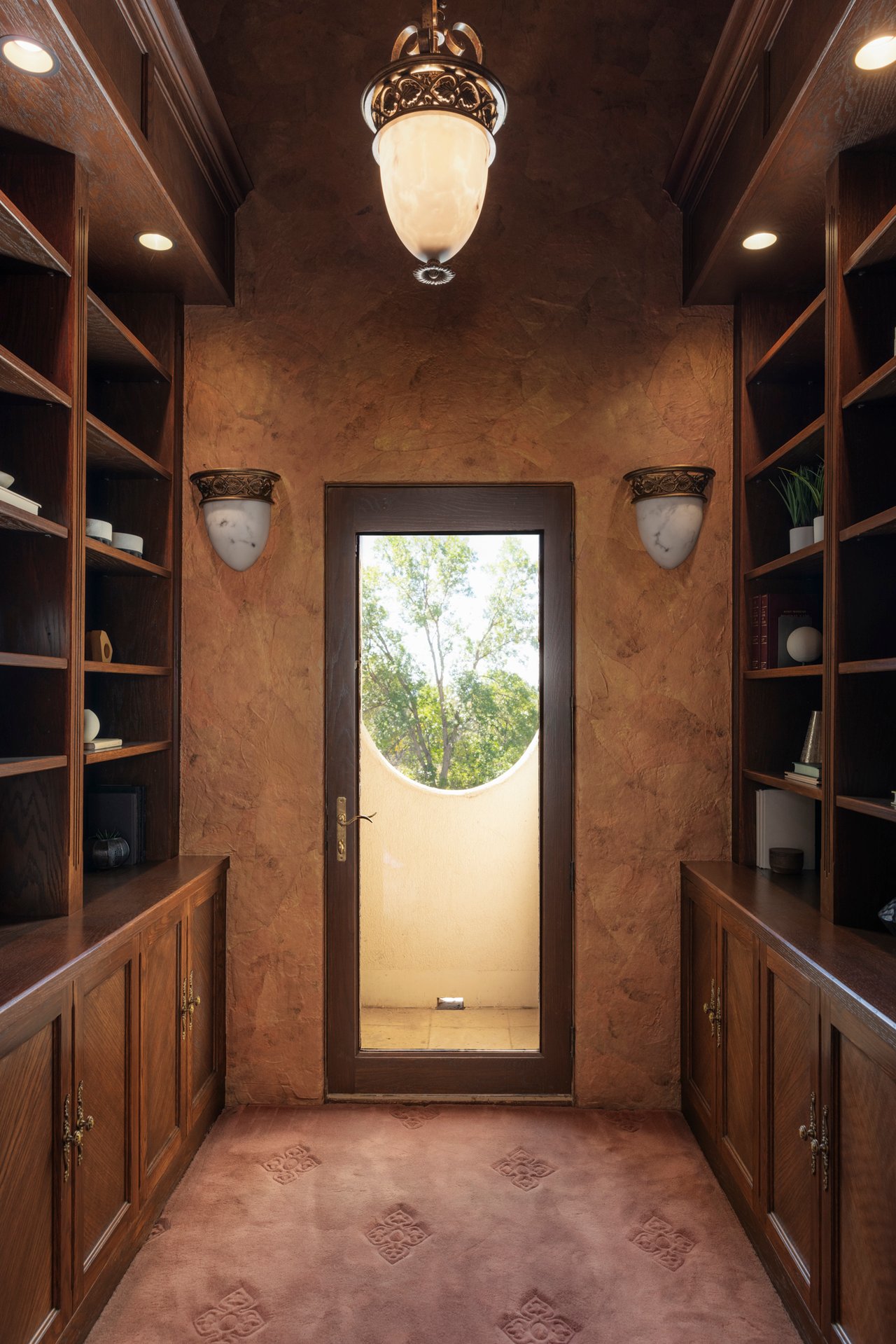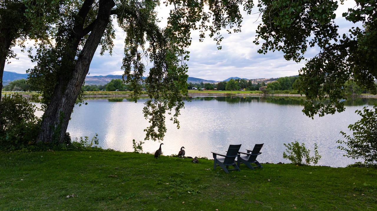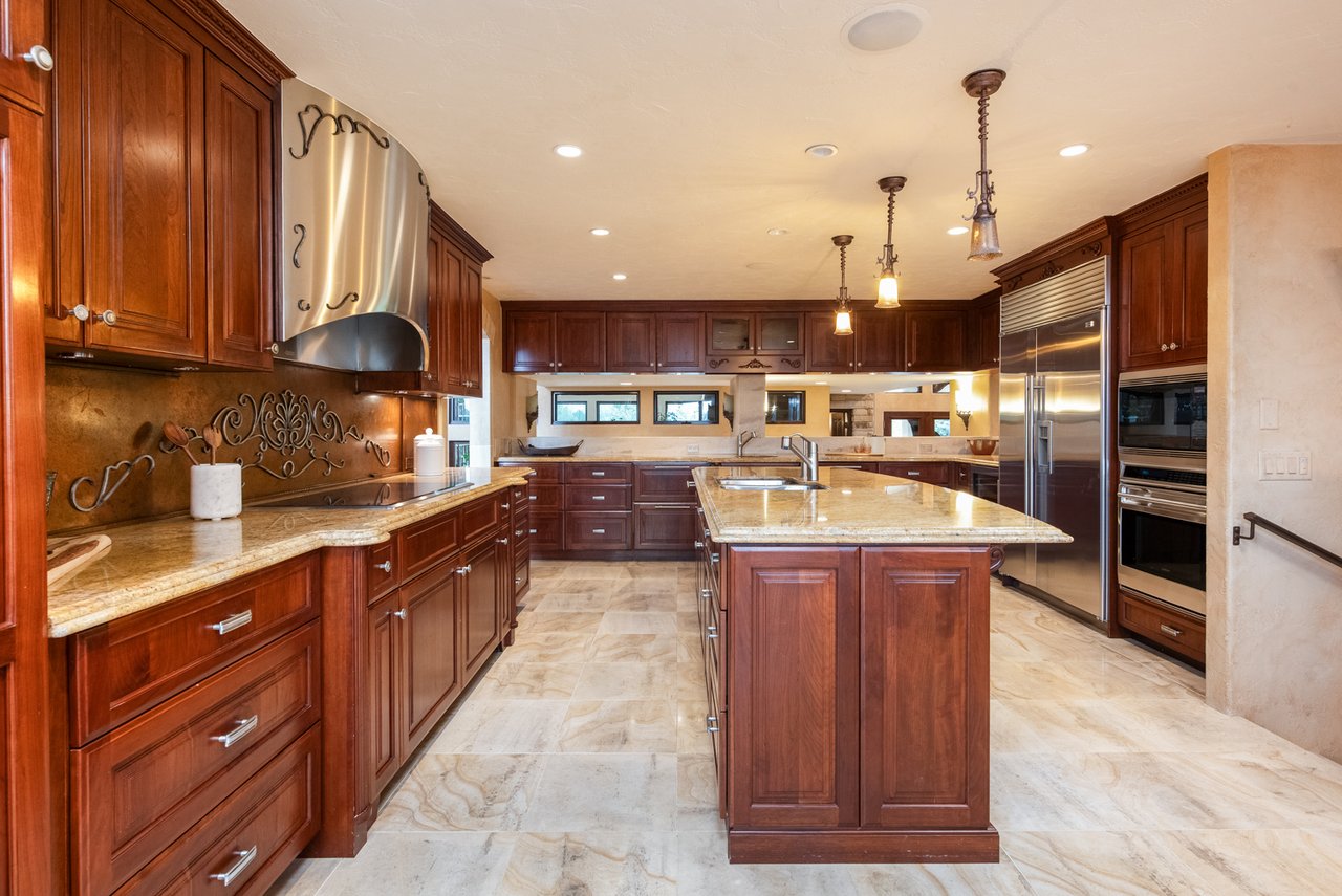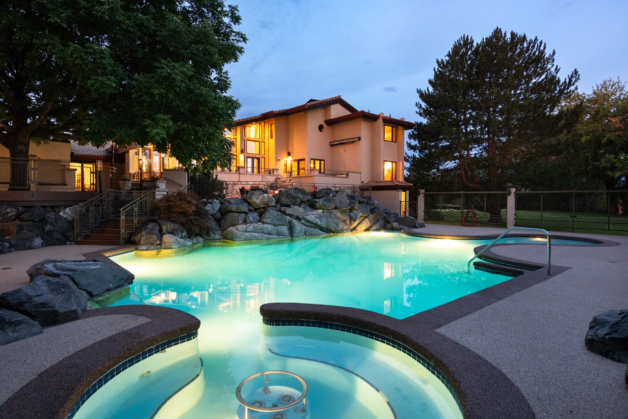 A grand entrance through a private gate sets the tone for an enchanting experience. A stately, winding pathway framed by mature trees leads you to the residence, revealing meticulously manicured landscaping, captivating views of your own idyllic ponds, and awe-inspiring mountains. The home's elegant facade, featuring a stunning custom metalwork tree on the front door, commands attention.