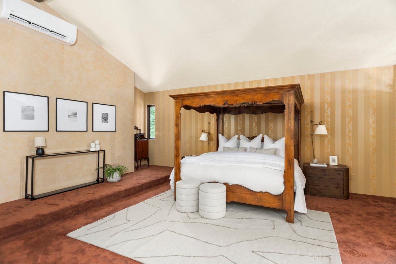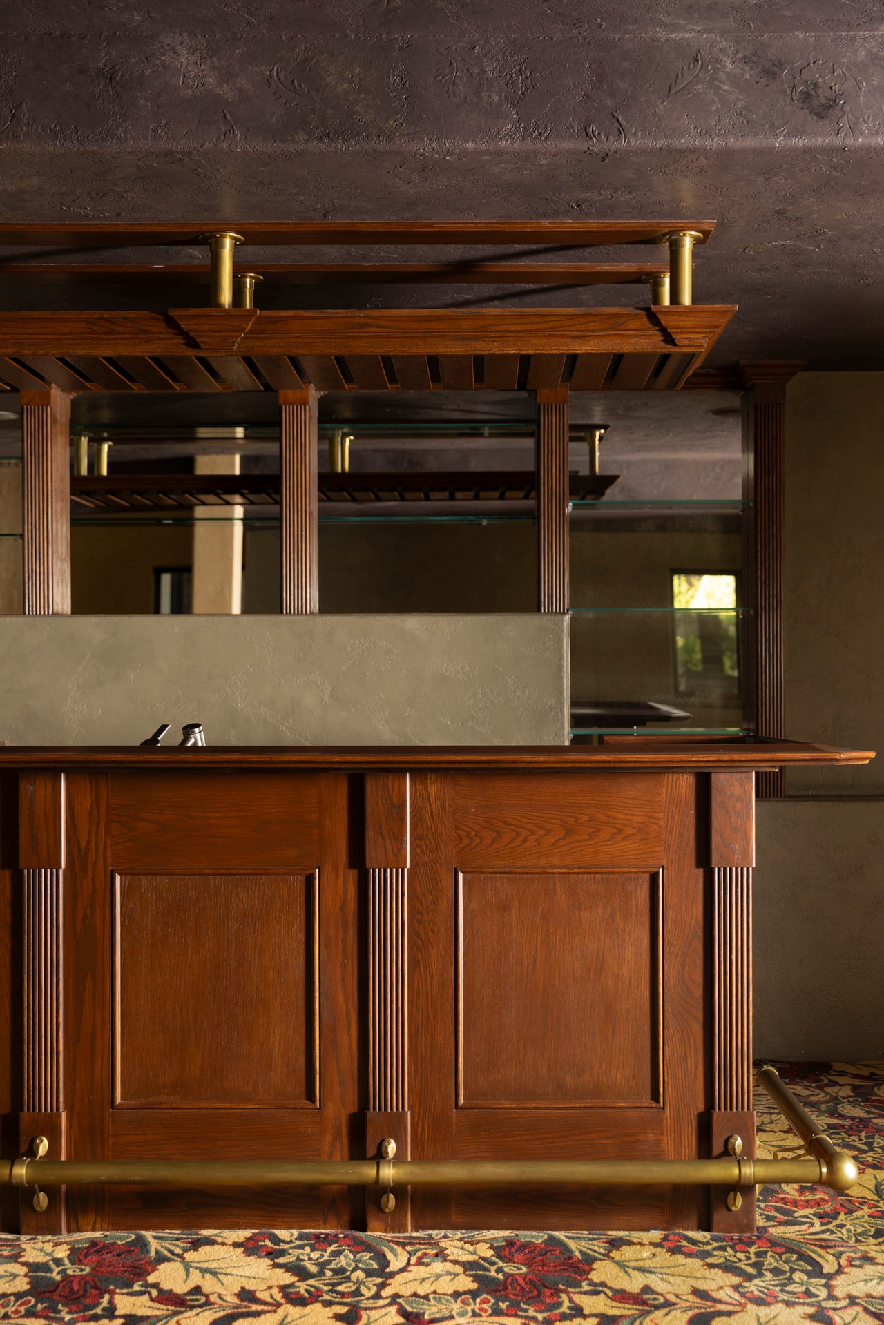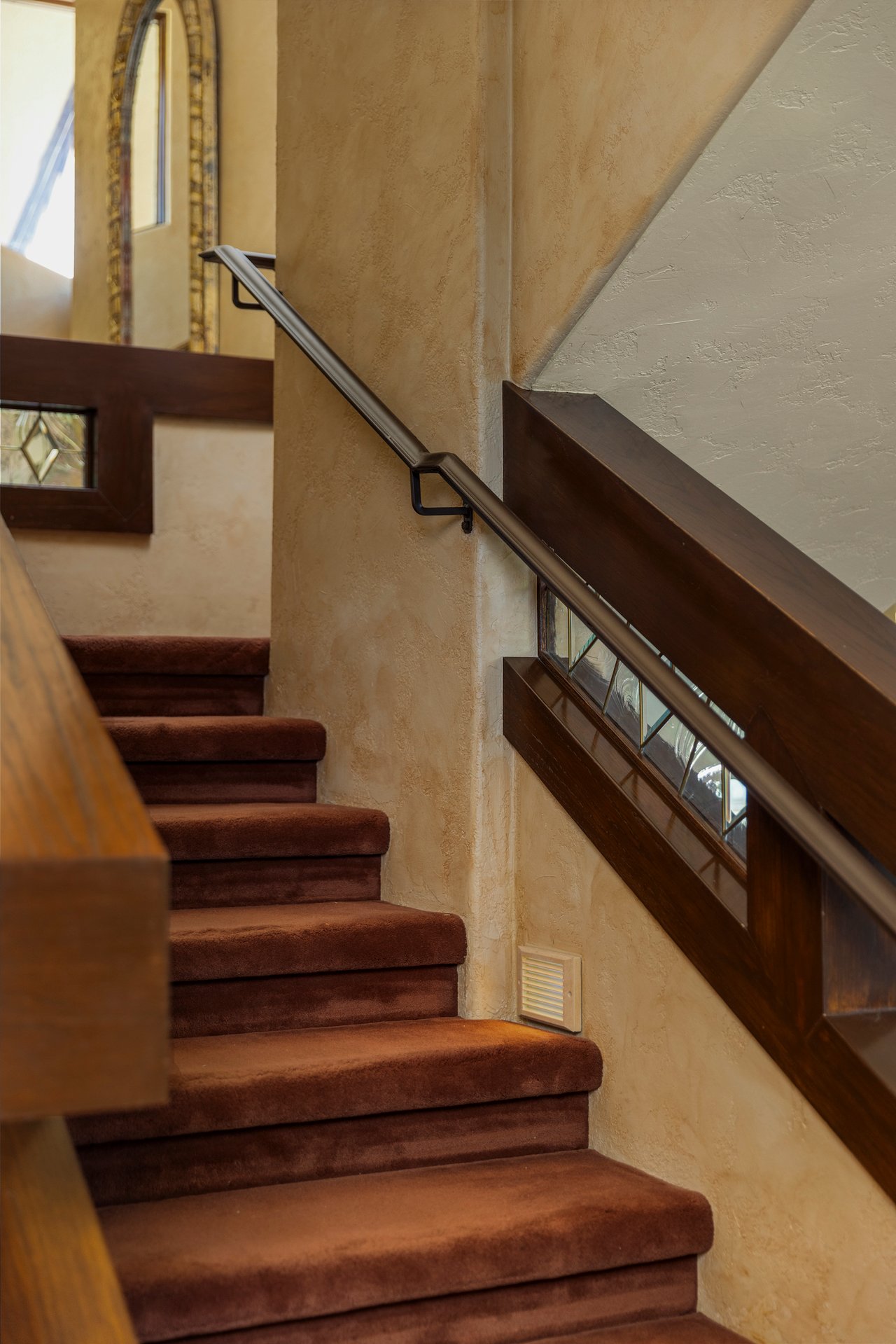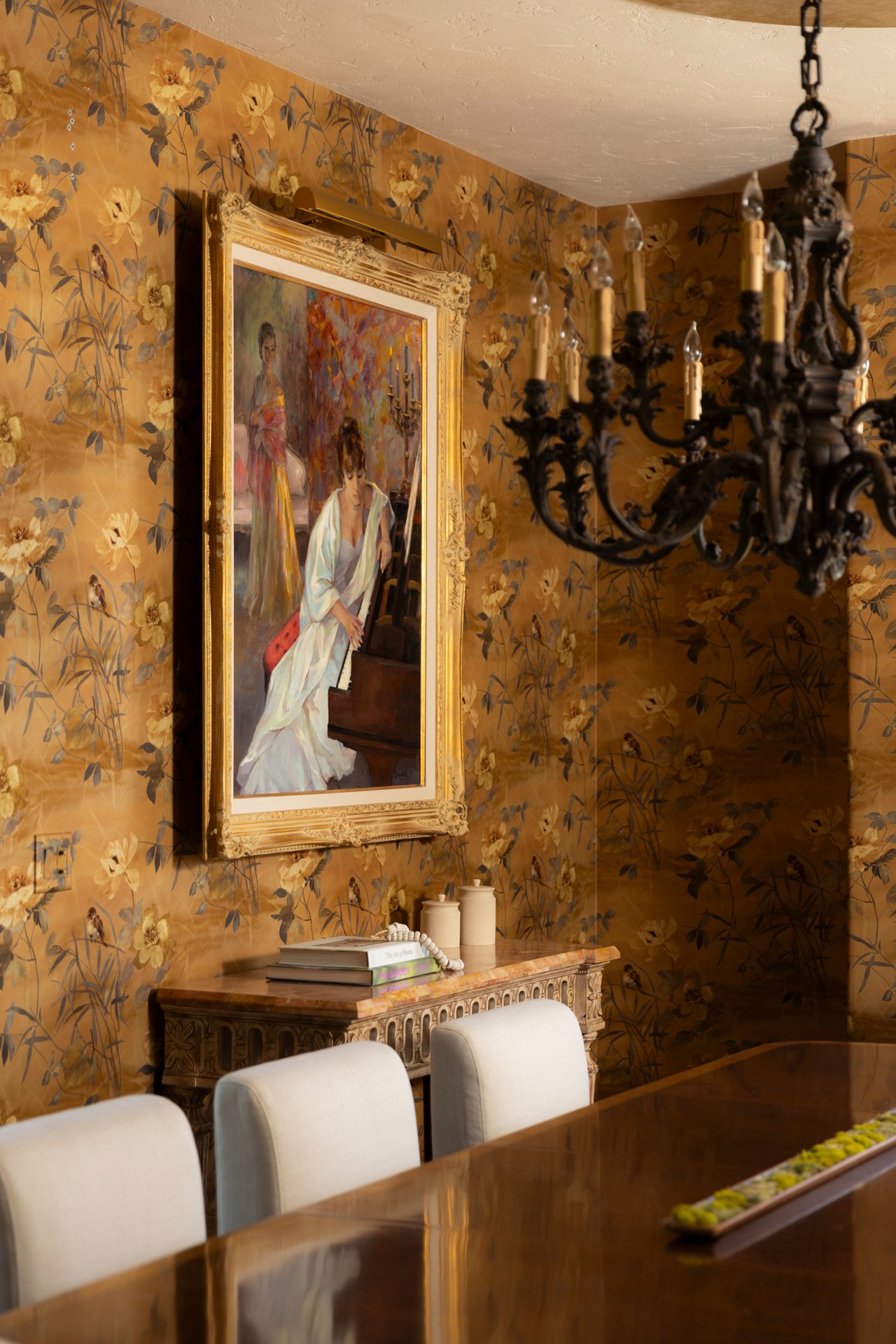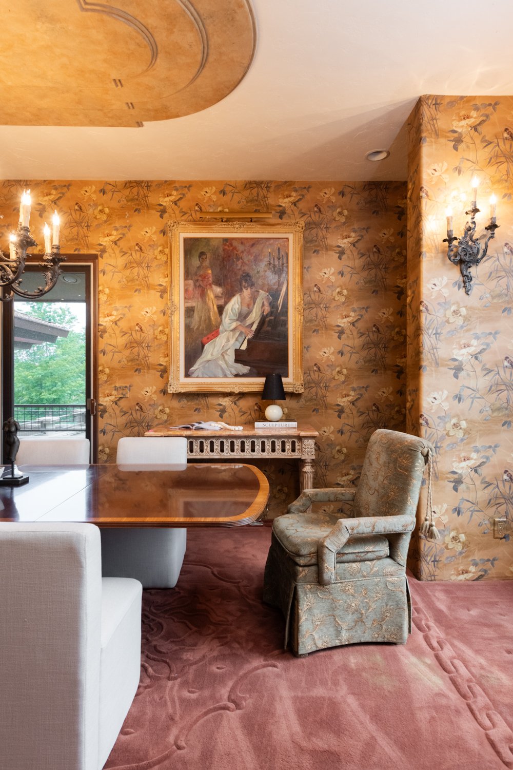 A grand entrance through a private gate sets the tone for an enchanting experience. A stately, winding pathway framed by mature trees leads you to the residence, revealing meticulously manicured landscaping, captivating views of your own idyllic ponds, and awe-inspiring mountains. The home's elegant facade, featuring a stunning custom metalwork tree on the front door, commands attention.